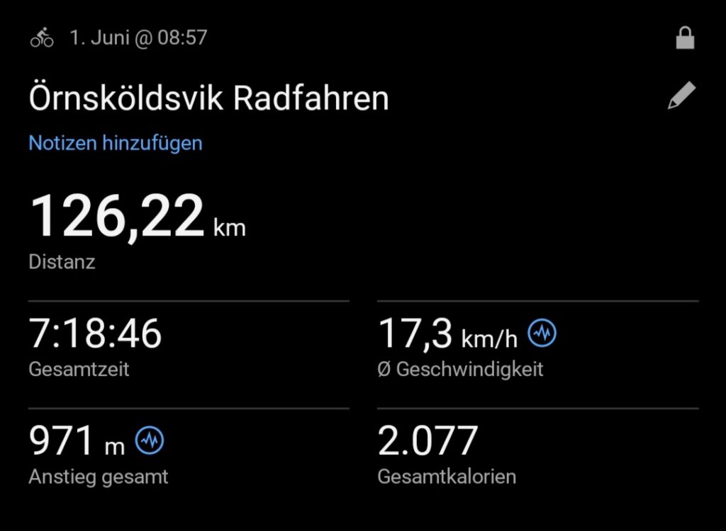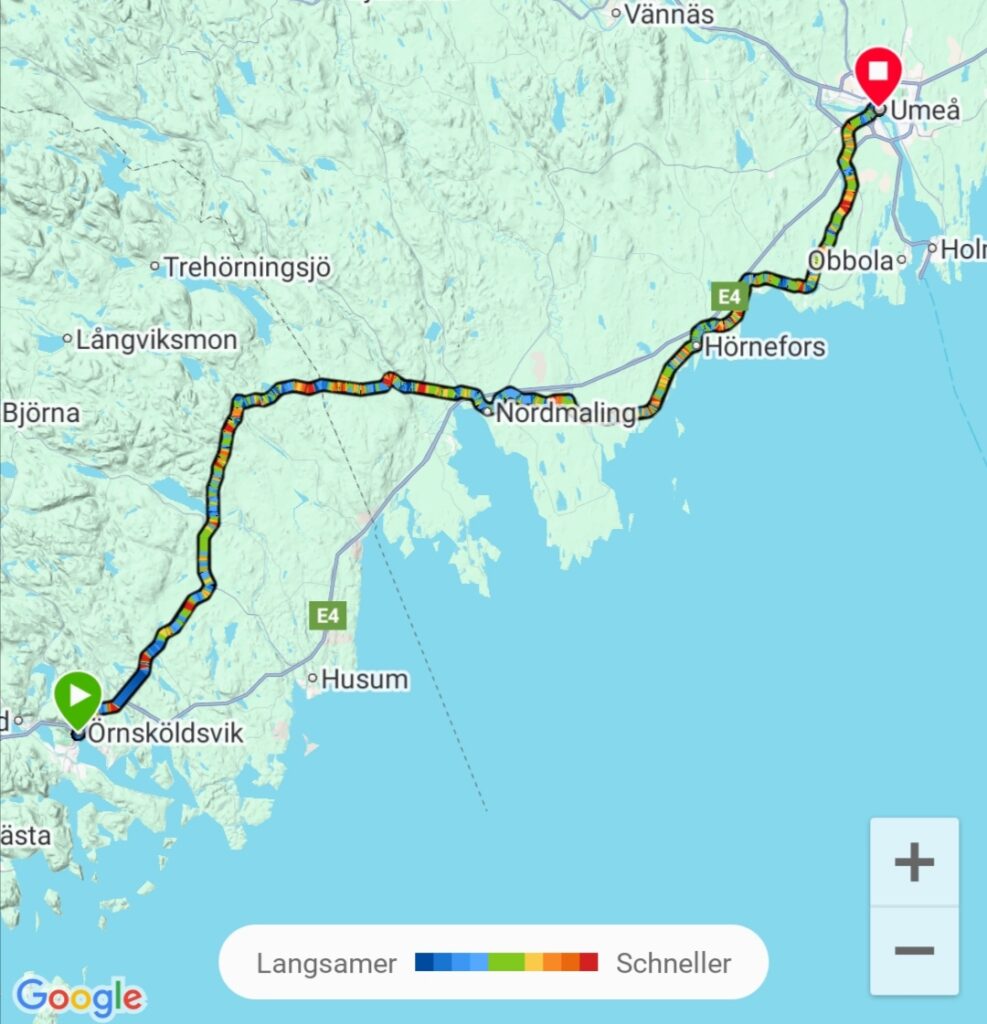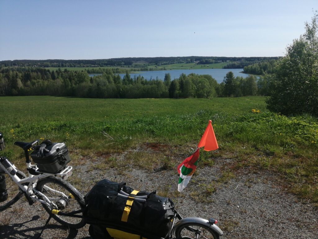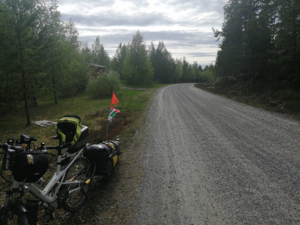 Nach 85 Kilometer um halb fünf halte ich an einer Einfahrt und prüfe meine Position. Bis nach Umea sind es noch 40 Kilometer. Von der Straße biegt ein Rennradfahrer in der Einfahrt ab. Er wohnt hier. Natürlich, mit einem Blick auf die Fahne fragte er mich, woher ich komme. Er weiß, Augsburg liegt nah an München, er ist immer wieder in München und auch in Österreich zu Besuch. Ich fragte ihn nach dem besten Weg nach Umea. Er check die Route an meinem Navi und sagt mir, dass diese ist gut, er nimmt auch die selbe wenn er mit dem Rennrad nach Umea fährt. Sie ist durchgehend asphaltiert, kein Stück Schotter. Das freut mich zu hören, es kann tatsächlich klappen bis nach Umea heute. Ich mache mich jetzt auf den Weg.