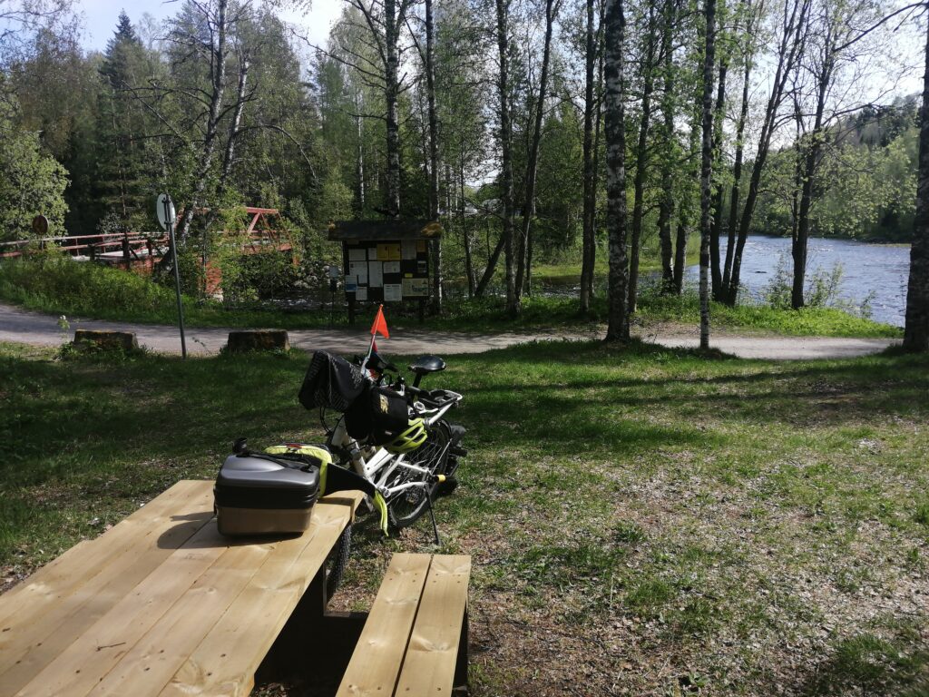 Gegen 14 Uhr fahre ich an einem schönen Rastplatz an einem Fluss und mache dort eine Pause und esse.